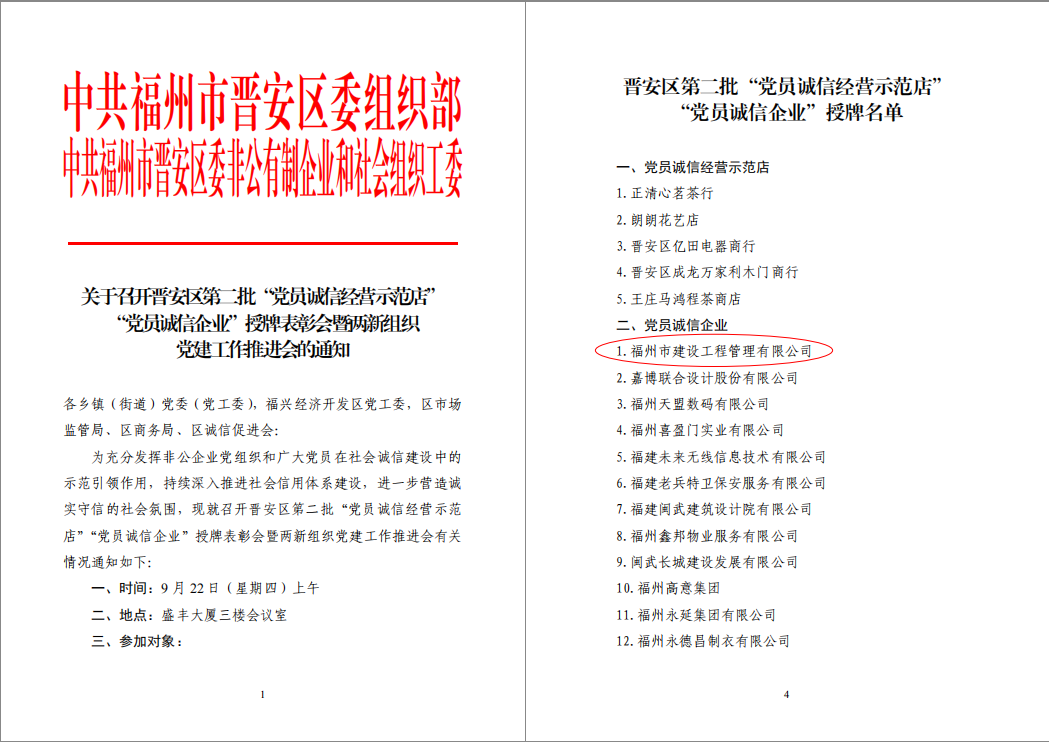9月22日上午,晉安區(qū)委組織部等部門聯(lián)合舉辦晉安區(qū)第二批“黨員誠信示范店”“黨員誠信企業(yè)”授牌表彰會,我司榮獲“黨員誠信企業(yè)”榮譽稱號。這個稱號是對我司長期以來誠信經營的肯定,也是對我們今后堅持誠信合法經營的一種鞭策。
